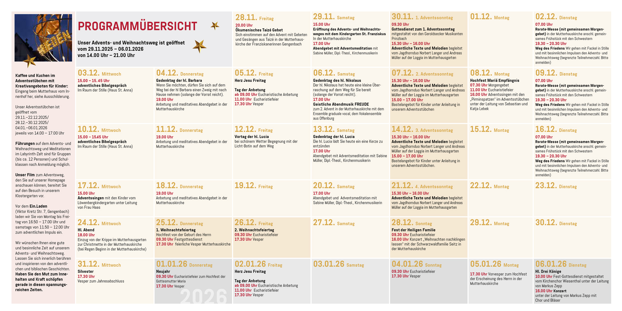 29.11. – 22.12.2025 / 28.12. – 30.12.2025 / 04.01. – 06.01.2026 jeweils von 14:00 – 17:00 Uhr.